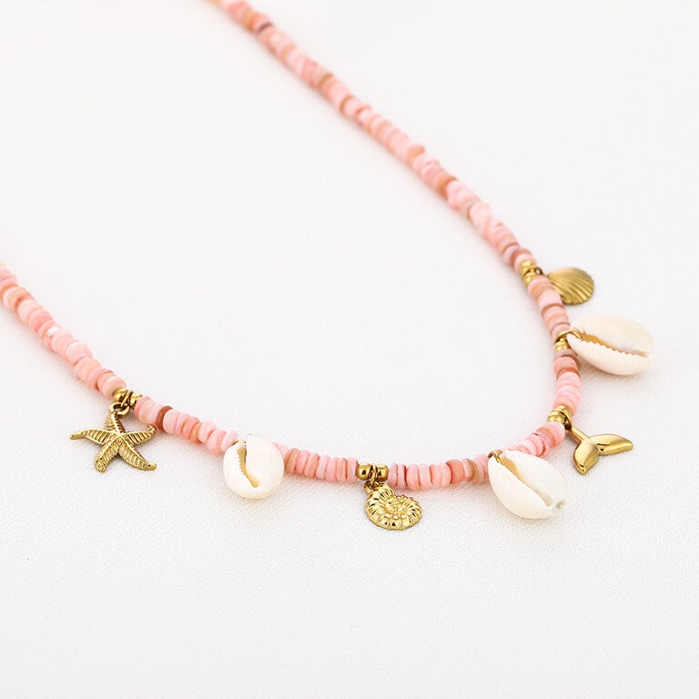 Deze ketting is van schelpenkralen en heeft stainless steel afwerkingen